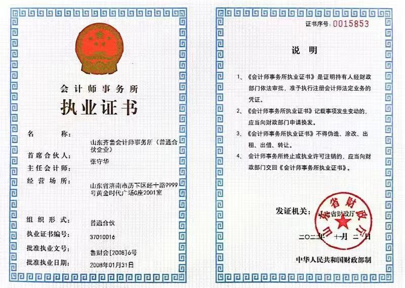 山东齐鲁会计师事务所执业证书